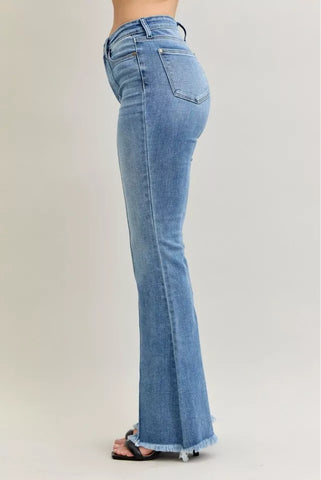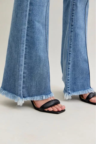 Meet your new favorite pair of flares — the perfect blend of vintage charm and modern style. These high-waist jeans are designed to flatter, with a fitted silhouette that highlights your shape and a front pintuck detail that adds a sleek, tailored touch.